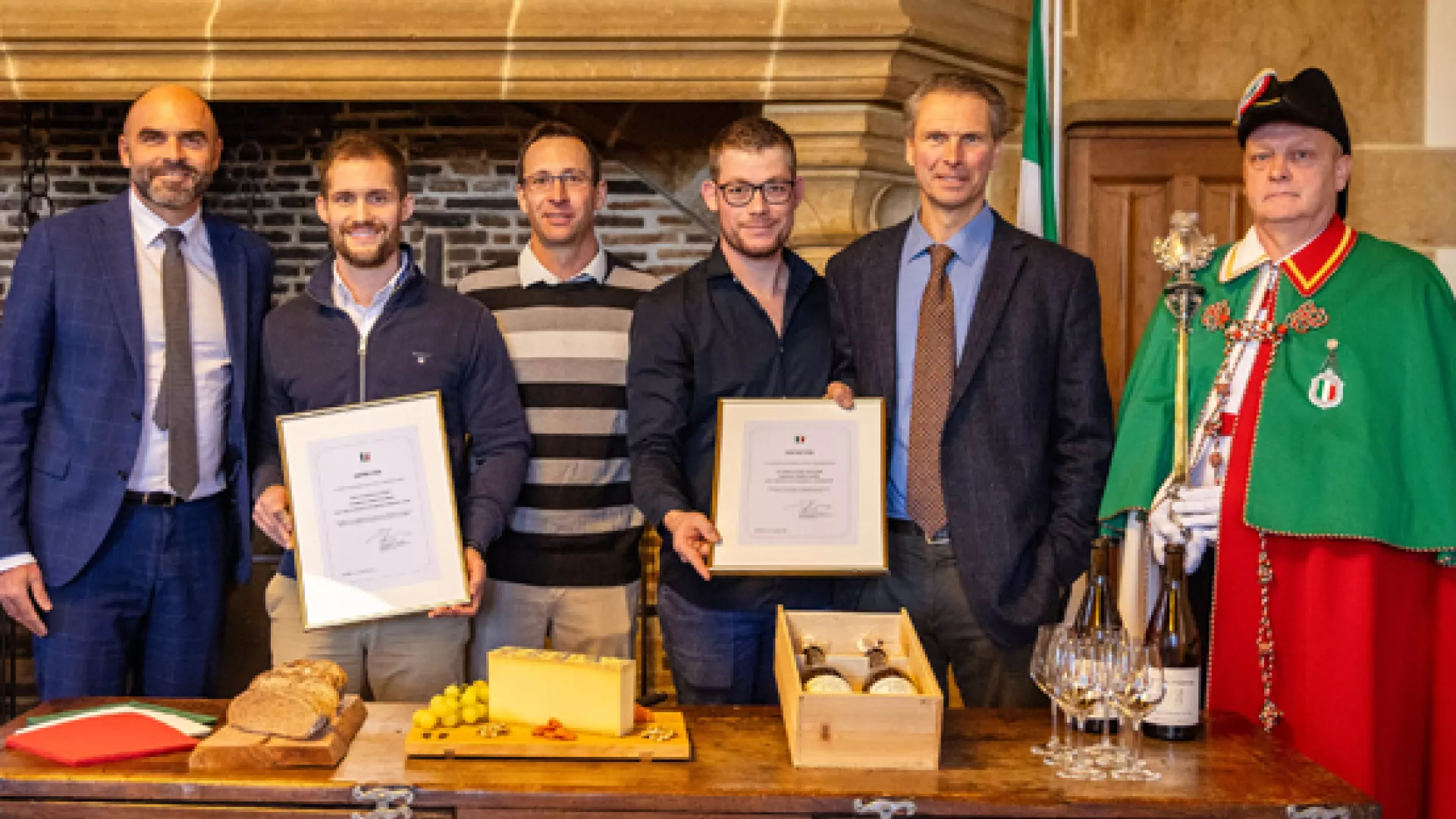 Photo : cérémonie au Château de Neuchâtel : le conseiller d’État Laurent Favre avec les lauréats 2025, la fromagerie de Chézard-Saint-Martin (Julien Linford et Daniel Christen) et le Domaine de l’Hôpital Pourtalès à Cressier (Loïc Veillard et Thierry de Pourtalès) avec l’huissier du Conseil d’État (crédit : Julien Humbert-Droz, chancellerie d’État).