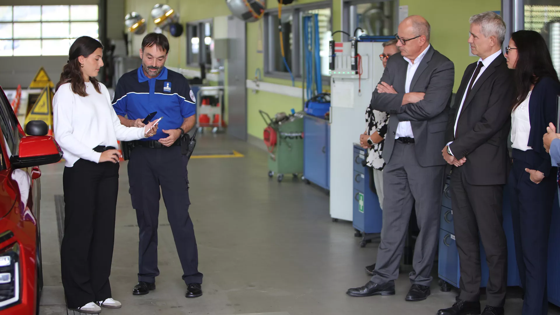 Photo : démonstration d'un contrôle du permis d'élève d'électronique lors de la conférence de presse au service cantonal des automob​iles et de la navigation (SCAN), à Boudevilliers (crédit : chancellerie d'État).