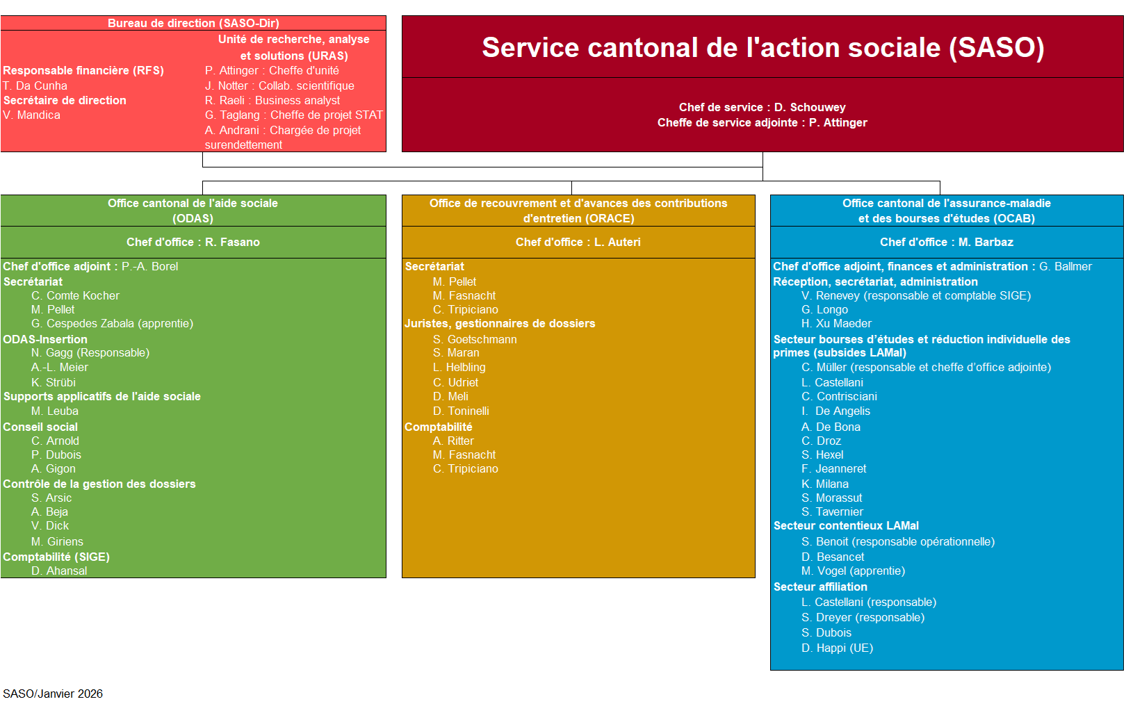 Le service cantonal de l'action sociale fonctionne dans les champs de compétences précités selon l'organigramme figurant sous téléchargement.