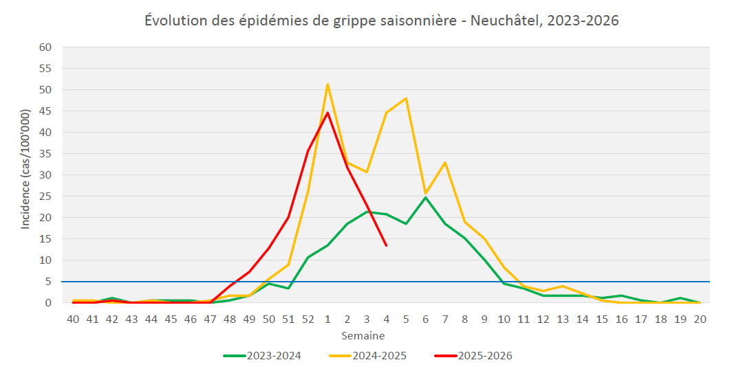 La grippe saisonnière a atteint un pic lors de la semaine 1 / 2026 dans le canton de Neuchâtel. L'activité grippale continue de baisser. Seuls les virus Influenza de type A sont actuellement en circulation.