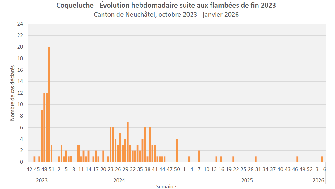 La coqueluche est une maladie infectieuse aiguë des voies respiratoires. Cette maladie très contagieuse se transmet par voie aérienne : l'agent pathogène se retrouve en suspension dans l'air lorsqu'une personne infectée tousse, éternue, parle. Elle est particulièrement dangereuse pour les nouveau-nés et les nourrissons de moins de 6 mois. Ces derniers peuvent développer des complications telles que pneumonies ou arrêts respiratoires.