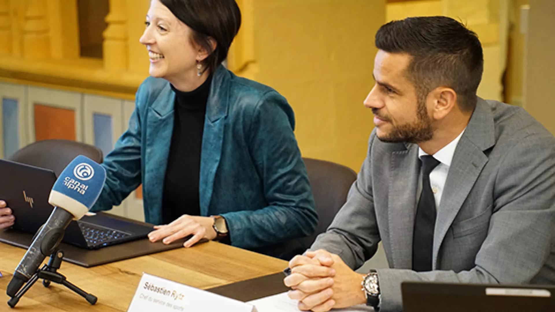 Photo: Neuchâtel, 26.10.2023, Conférence de presse - Crystel Graf, conseillère d'État, cheffe du Département de la formation, de la digitalisation et des sports; Sébastien Rytz, chef du service cantonal des sports (SP Chancellerie d'État).