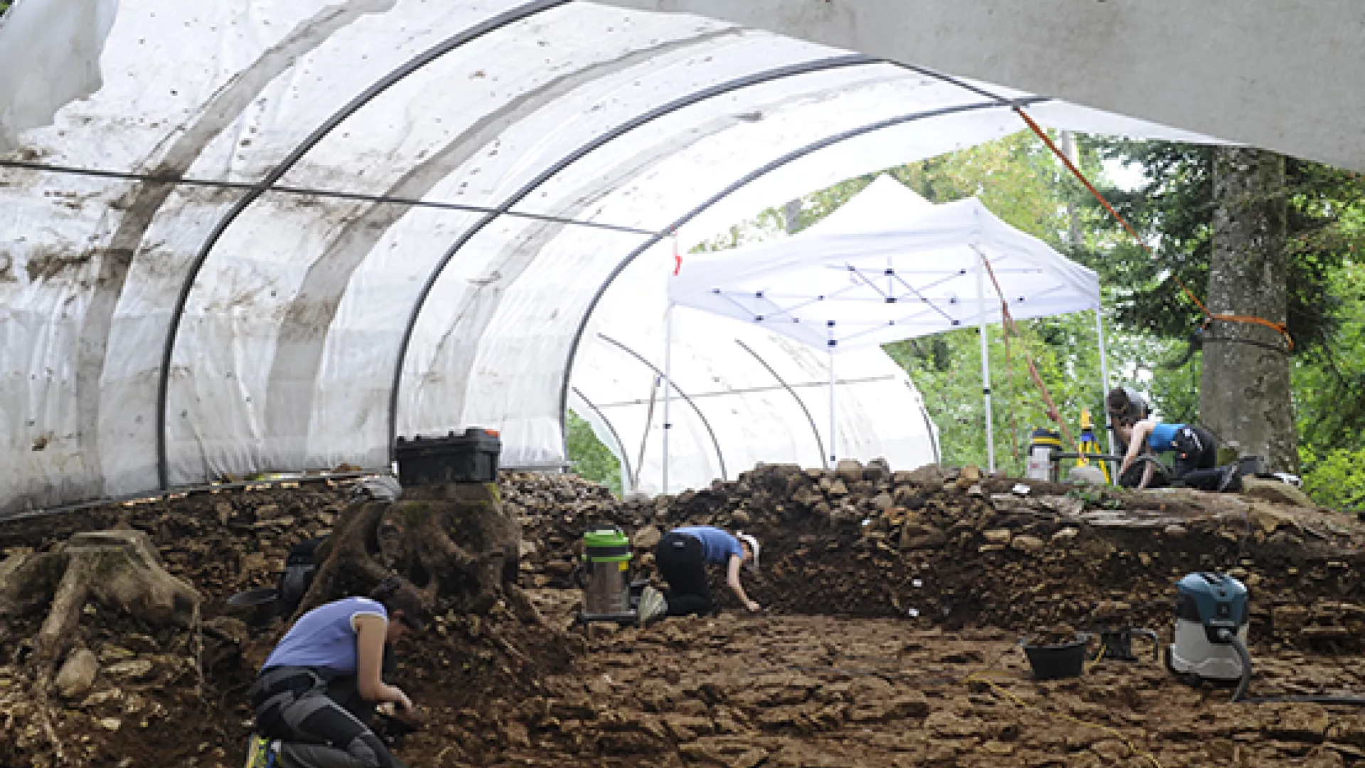 Dans cette perspective, un programme de recherches de terrain, articulé en plusieurs campagnes annuelles, a été initié en 2021, avec pour objectif la fouille, la documentation et la compréhension du monument funéraire et de son environnement. En plus de répondre aux enjeux scientifiques et patrimoniaux, la démarche se veut également formatrice et didactique, en organisant les opérations sous forme de fouille-école. Durant un mois, des étudiant-e-s en archéologie de l'Université de Neuchâtel ont ainsi l'opportunité de se familiariser et de se former aux outils et aux méthodes d'investigation et de documentation archéologique actuels, grâce à l'encadrement d'une équipe pluridisciplinaire de l'OPAN.