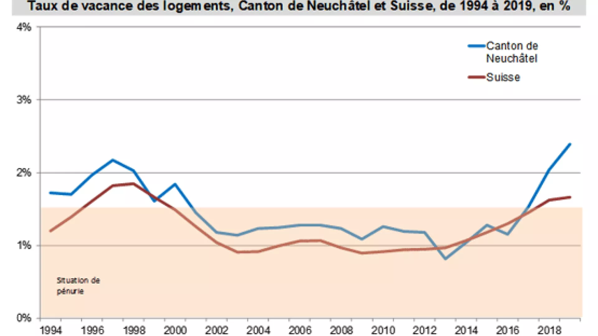 Au 1er juin 2019, le Canton de Neuchâtel présente un taux de vacance des logements de 2,39%, au-dessus du seuil de pénurie fixé à 1,5%. Avec 2281 appartements disponibles sur l’ensemble du canton, la détente du marché immobilier entamée depuis quelques années se confirme comme au plan national. Ces informations sont extraites de l’enquête annuelle sur les logements vacants effectuée par le service de statistique.